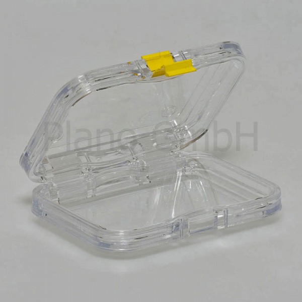 Průhledná polysterenová krabička na ukládání vzroků a jiných drobných předmětů v laboratoři. Uvnitř je tenká Platilon™ folie. Je to vysoce elastický, chemicky neutrální polyuretanový film, který se deformuje okolo objektu. Tím ho pevně drží v pozici. Krabička je opatřena pojistnou sponou.