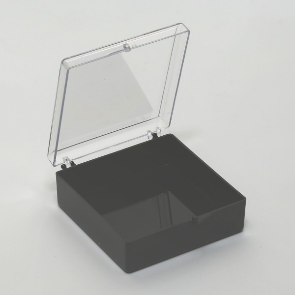 Styrenová krabička na ukládání vzroků a jiných drobných předmětů v laboratoři. Odklápěcí víko průhledné, základna černá.