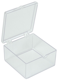 Styrenová krabička na ukládání vzroků a jiných drobných předmětů v laboratoři. Krabičky jsou průhledné. Mají odklápěcí víčko.