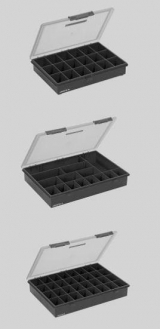 Krabička s odklápěcím víčkem na tříděné ukládání vzroků, držáků nebo jiných drobných součástek. Použitým materiálem je polypropylen. Průhledné víko. Vynikající kvalita.