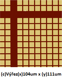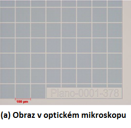 Tento vzorek je vyroben z monokrystalu křemíku, celkové rozměry jsou 5x5 mm. Na povrchu jsou elektronovým svazkem vyznačeny jasně viditelné čtverce s periodicitou 5 um +/-0,05 µm (obraz (b), tzn. hrana okna má délku 4µm. Dělící linie mají tloušťku cca 1 µm a jsou vyrobeny elektronovou litografií. Jejich hloubka je cca 250 nm. Každý testovací vzorek má unikátní seriové číslo. Širší čára je umístěna každých 500 um, což lze využít i ve světelné mikroskopii. Tento vzorek je výborný pro porovnávání zvětšení a zjišťování jakéhokoli zkreslení obrazu.