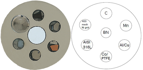 - EDX-Checker S8 s C, PTFE, Mn, Co a Al/Cu jako referenčními materiály, AISI 316L pro kontrolu kvantitativních analýz a Ni-síťkami s hustotami 400 a 1000 mesh pro rychlou kontrolu a kalibraci zvětšení a X-ray mapování. Ideální pro stolní mikroskopy SEM se systémy EDS.