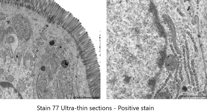 EM Stain 77 je barvicí roztok určený pro EM barvení, který nabízí netoxickou a originální alternativu k uranylacetátu. Je tvořen směsí lithných a wolframových solí ve vodě. Stain 77 účinně zvyšuje pozitivní i negativní kontrast. Výsledky kontrastu po zesílení citrátem olovnatým se shodují nebo dokonce překonávají výsledky uranylacetátu. V případě, že Uranyless nemusí přinést optimální výsledky, slouží Stain 77 jako ideální alternativa k vodnému Uranyless.