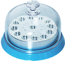 Tuhý, kruhový a stabilní přípravek pro přípravu vzorků. Je vhodný pro válcové nosiče JEOL o ᴓ9,5mm a ᴓ 12,2mm. Udržuje příslušné druhy stubů naplocho v očíslovaných pozicích a tím zabraňuje záměnám při přípravě několika vzorků najednou. Může být osazen až 12x válcovými nosiči JEOL ᴓ9,5mm, nebo ᴓ12,2mm. Vyrábí se z hliníku o kvalitě vhodné do čistých prostor, polystyrenu a ABS. Celkové rozměry včetně protiprachového krytu jsou ᴓ105 x 75mm.