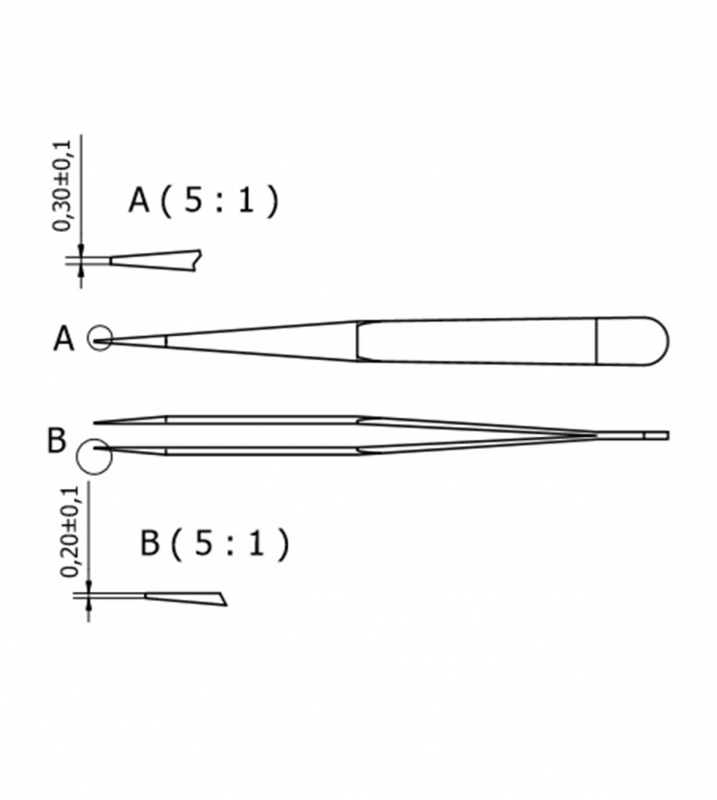 | Špičaté, ostré, velmi jemné hroty | 0,30 ± 0,1 | 0.20 ± 0,1 | 120mm 97 ± 1mm | Stainless Steel |